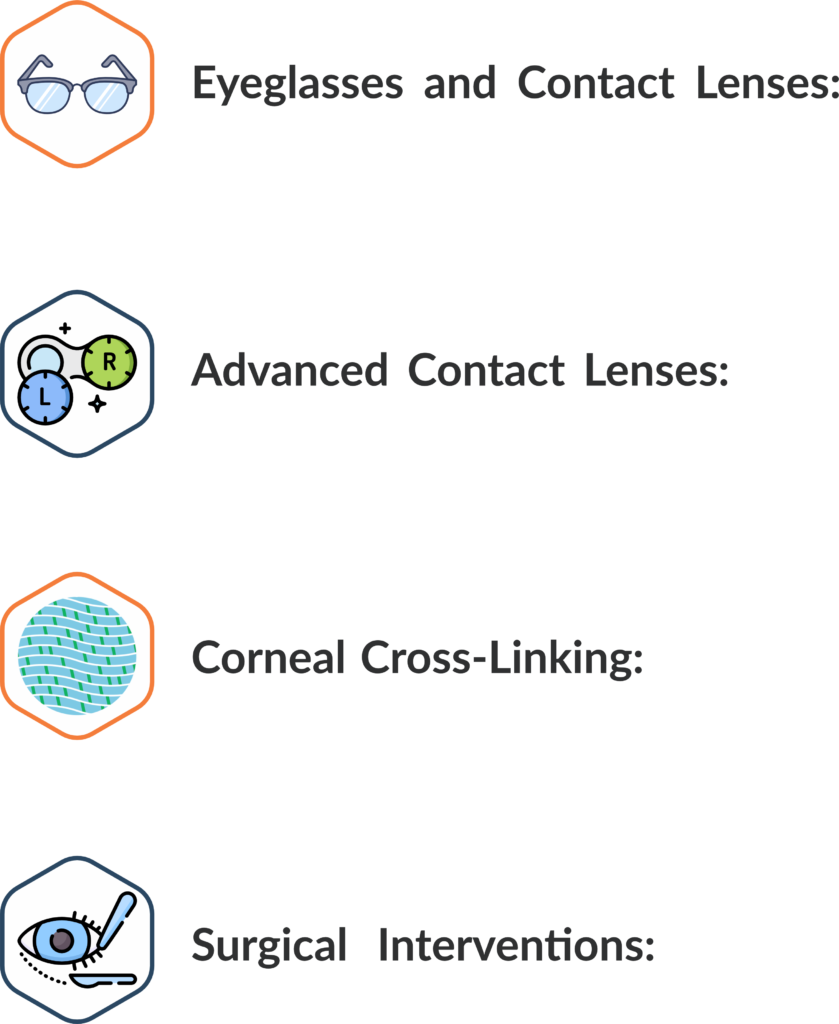 Eyeglasses and Contact Lenses: Mild to moderate keratoconus can often be managed with specialized eyeglasses or contact lenses designed for irregular corneas.